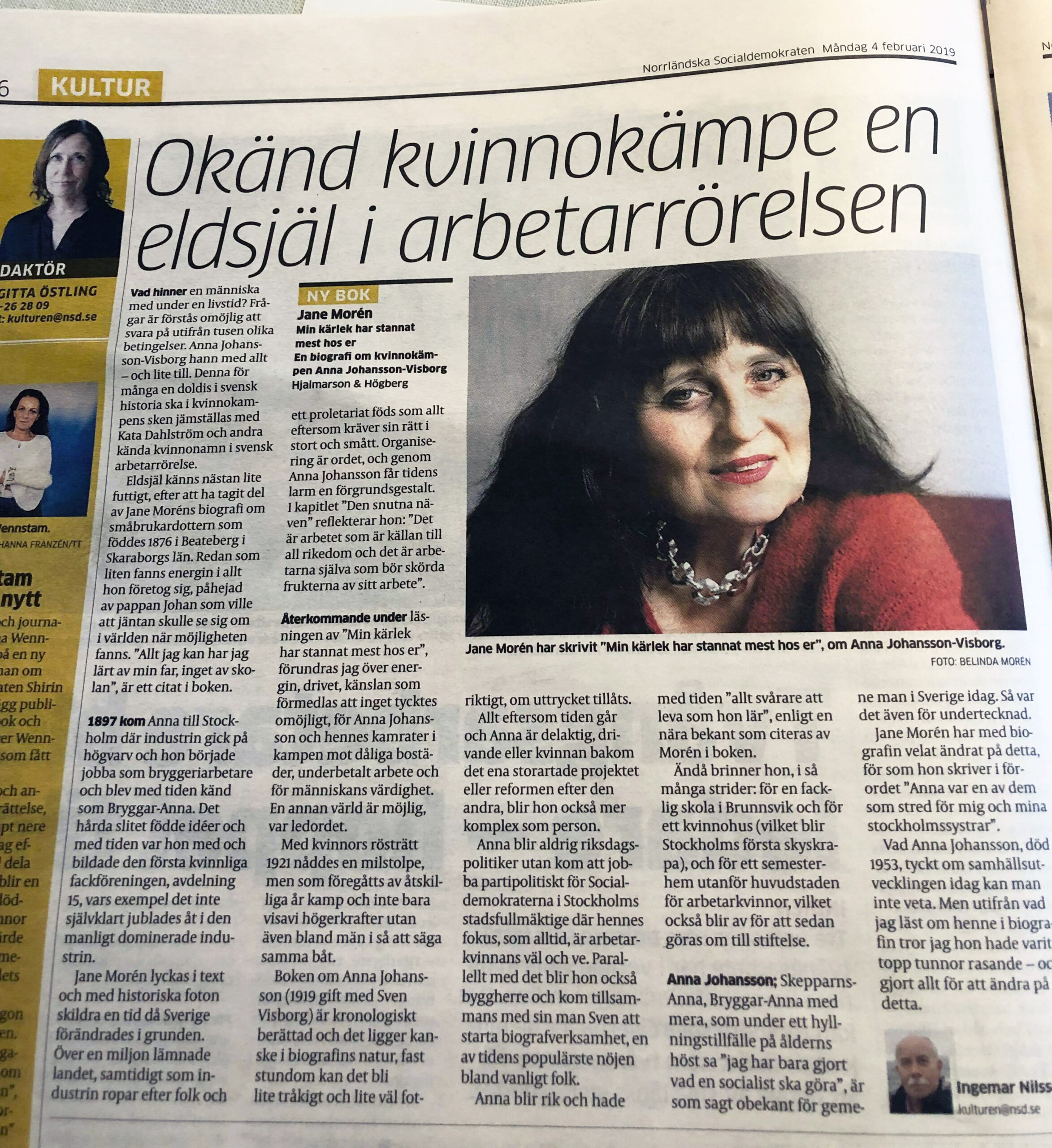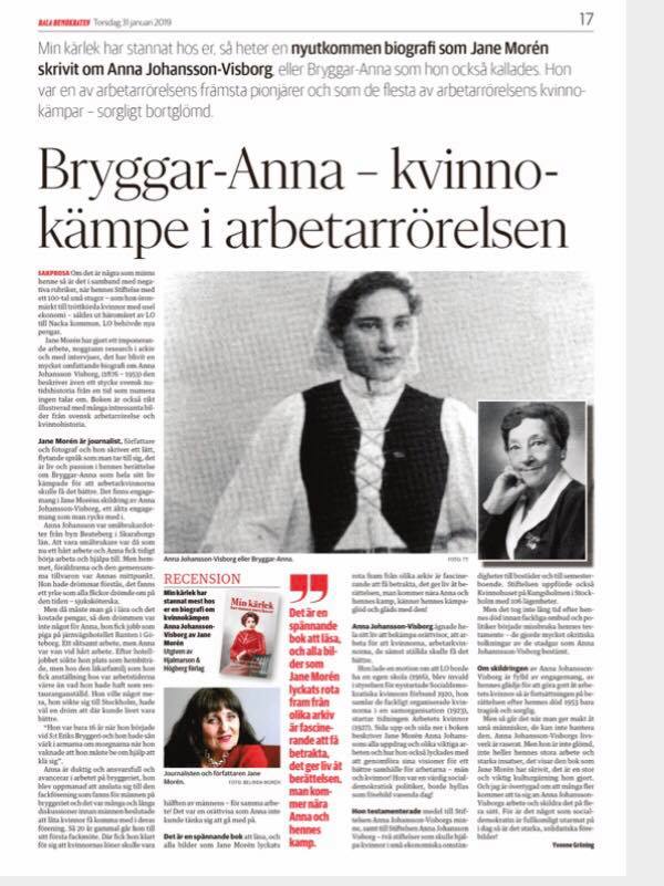 : “Jane Morén har gjort ett imponerande arbete, noggrann research i arkiv och med intervjuer, det har blivit en mycket omfattande biografi om Anna Johansson Visborg, (1876 – 1953) den beskriver även ett stycke svensk nutidshistoria från en tid som numera ingen talar om.”