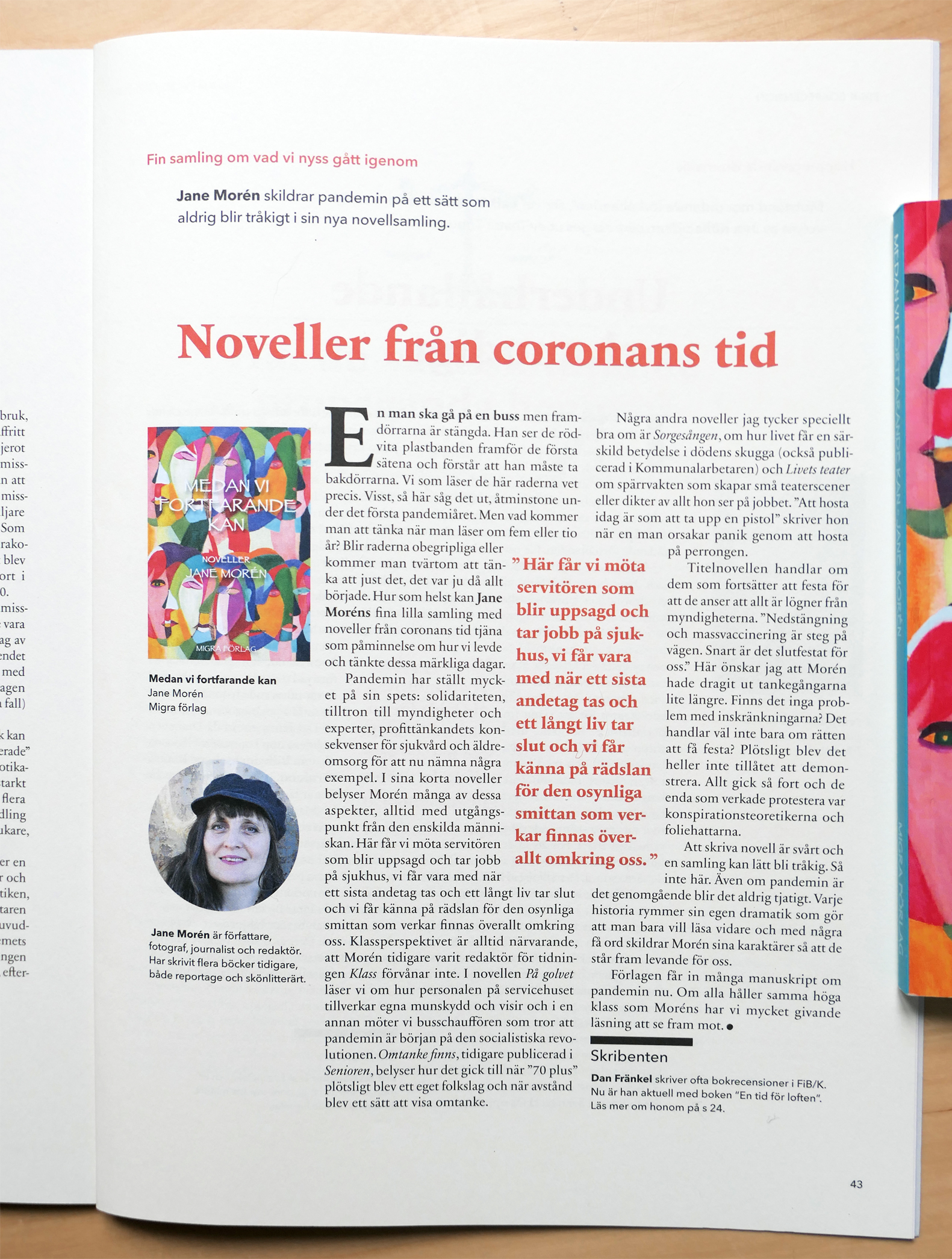 ” Det är en förvånansvärt komplett skildring Morén gör av hur människor upplever, ser på och drabbas av coronaviruset. Hela spektrumet från bacillskräcken till antivaxx-idéerna ryms på de drygt hundra sidorna. Trots att novellerna är korta så tränger sig deras karaktärer fram med ett djup som engagerar. ”