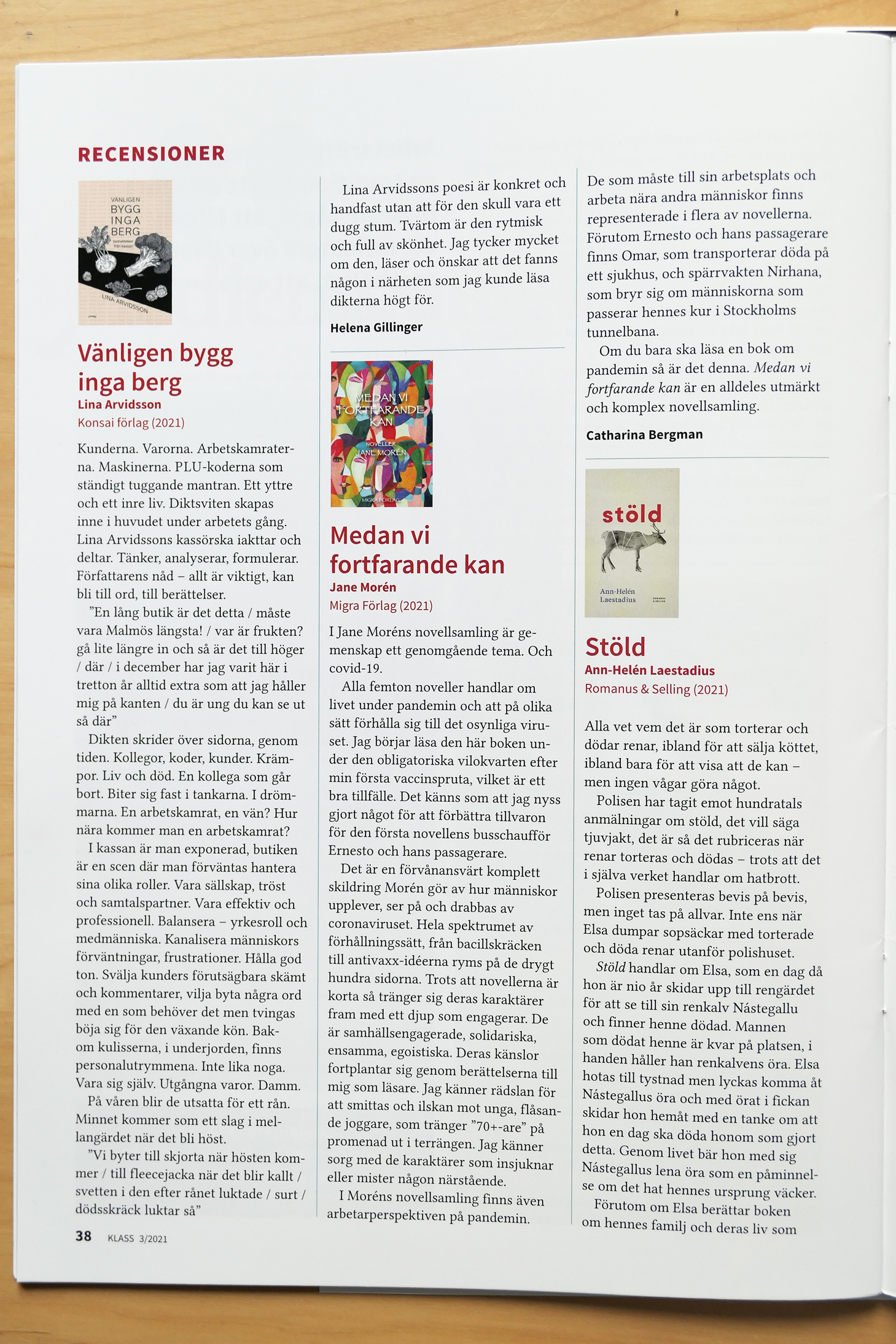 ” Dikterna och novellerna i samlingen håller genomgående hög kvalitet och många av dem är rent av mycket bra. Till den senare kategorin hör exempelvis Jane Moréns novell om klassamhällets återkomst, Betty och Klassklyftan“